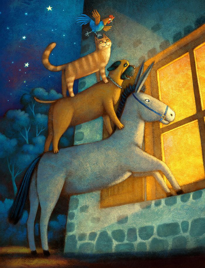 Doch plötzlich sieht der Hahn von Weitem ein kleines Licht. Es kommt aus einem Haus. „Vielleicht gibt es dort etwas zu essen“, denkt der Hund laut. „Lasst uns dort hingehen!“ Und so laufen sie weiter. Am Haus schauen die Tiere vorsichtig durch das Fenster. Drinnen steht ein Tisch mit leckerem Essen und Trinken. Da fehlt nichts: Brot, Braten, Käse, Obst und Wein. Um den Tisch sitzen drei Räuber mit bösen Gesichtern. Den hungrigen Tieren läuft das Wasser im Munde zusammen. „Wie bekommen wir etwa von dem Essen?“, fragt die Katze. Und dann haben sie auch gleich eine Idee: Sie stellen sich aufeinander. Der Esel schreit, der Hund bellt, die Katze miaut und der Hahn kräht aus vollem Hals. Die Räuber erschrecken. Ein Stuhl fällt um. Teller, Messer und Gabeln fliegen durch die Luft und die Räuber rennen wie wild aus dem Haus. Der Esel, der Hund, die Katze und der Hahn freuen sich. Sie essen und trinken von den vielen leckeren Sachen und machen es sich richtig gemütlich. Um Mitternacht legen sie sich hin und schlafen sofort ein. Im Haus wird es dunkel und still. Aber die Räuber kommen zurück. „Ist das Haus wieder leer? Oder gibt es dort vielleicht ein Gespenst?“ Ein Räuber schleicht vorsichtig zum Haus. Langsam öffnet er die Tür. Es ist stockfinster. Er sieht überhaupt nichts, nur schwarze Dunkelheit. Doch da, in der Ecke, funkeln zwei Augen wie Feuer… Und schon springt die Katze dem Räuber ins Gesicht. Er stolpert und fällt auf den Hund. Der Hund beißt ihn ins Bein und Esel tritt ihn in den Hintern. Der Räuber rennt so schnell er kann in den Wald zurück. Vom Haus hört er noch ein unheimliches Kikiriki. Die Räuber kommen nie wieder. Den Tieren gefällt es in dem Haus aber sehr gut. Sie bleiben dort, machen Musik und leben glücklich und zufrieden.